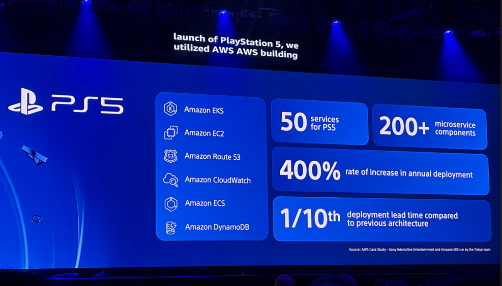 Keynoteの中盤には、ソニーグループの小寺剛 執行役 CDO(最高デジタル責任者) が登壇しました。ソニーがAWSと連携してエンタープライズAI基盤とエンゲージメントプラットフォームを構築していることが発表されました。PS5がAWS上で構築されているのは初めてて知りました。