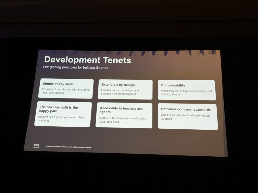 1つめのセッションは、AWSが開発したオープンソースのエージェントフレームワーク「Strands Agents SDK」についてです。今週TypeScript版がリリース(preview版)されたということで、開発チームから直接話を聞きたくて参加しました。