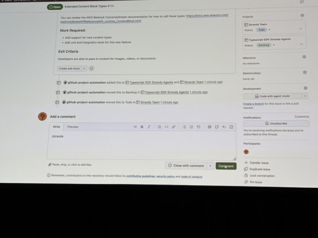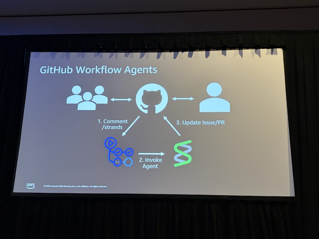 デモ動画では、IssueにコメントでSlash command(/strands)を打つと、エージェントがIssueを読んで質問を返し、それに回答するとさらに深掘りして…という流れが紹介されていました。最終的にエージェントが「実装可能な状態になった」と判断すると、実装フェーズに移行します。