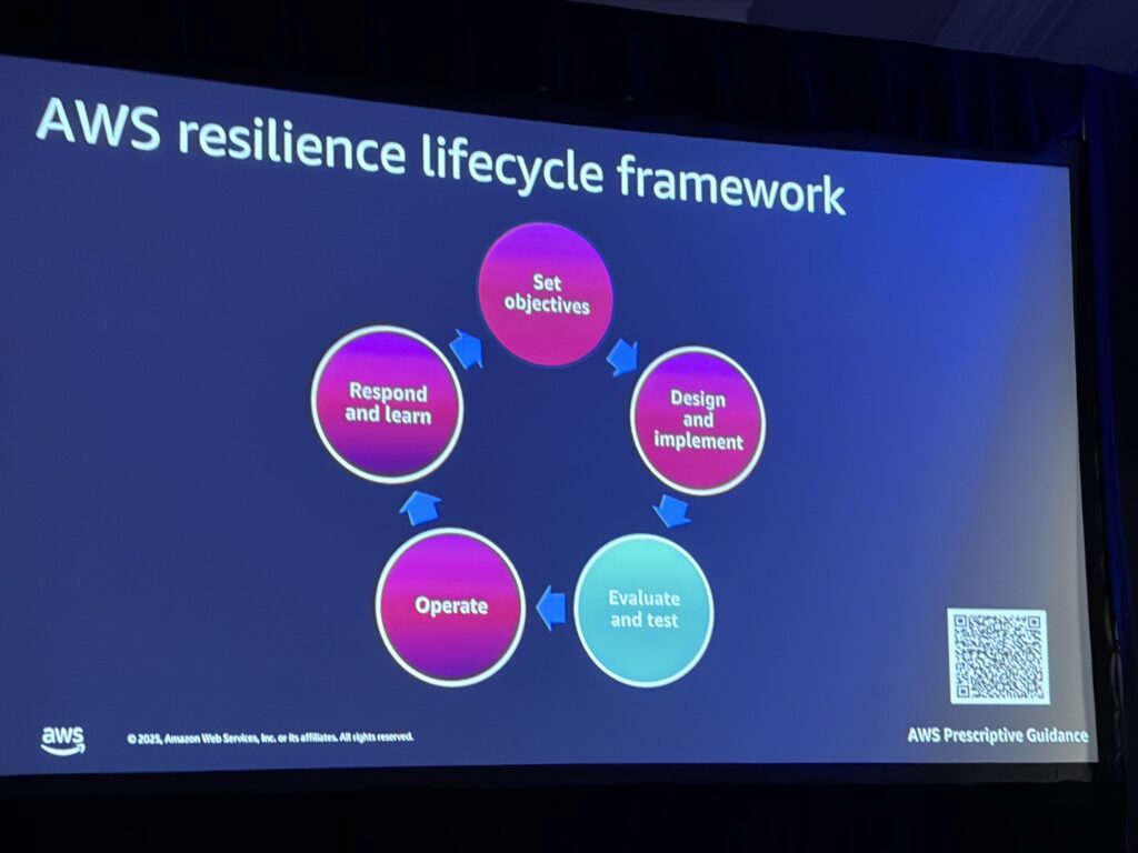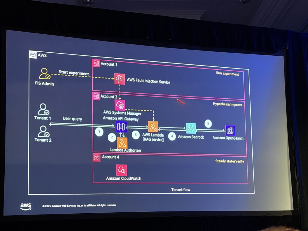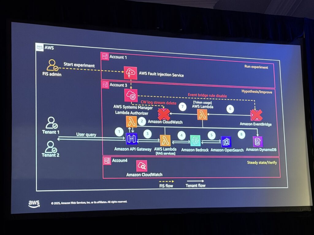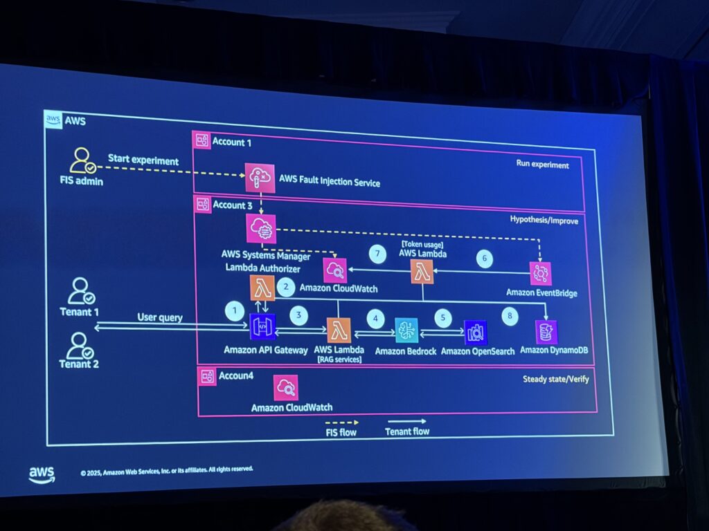 2つめのセッションは、SaaSアーキテクチャにおけるレジリエンステストパターンについてです。AWS Fault Injection Service(FIS)を使って、マルチテナント環境でどのように障害注入テストを行うかというテーマで、実際のデモを交えた非常に実践的な内容でした。