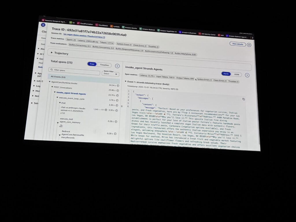 Rajeshさんによるデモでは、Strandsベースのエージェント(メモリツール + Web検索ツール)を使って、CloudWatchでのトレース確認が紹介されました。