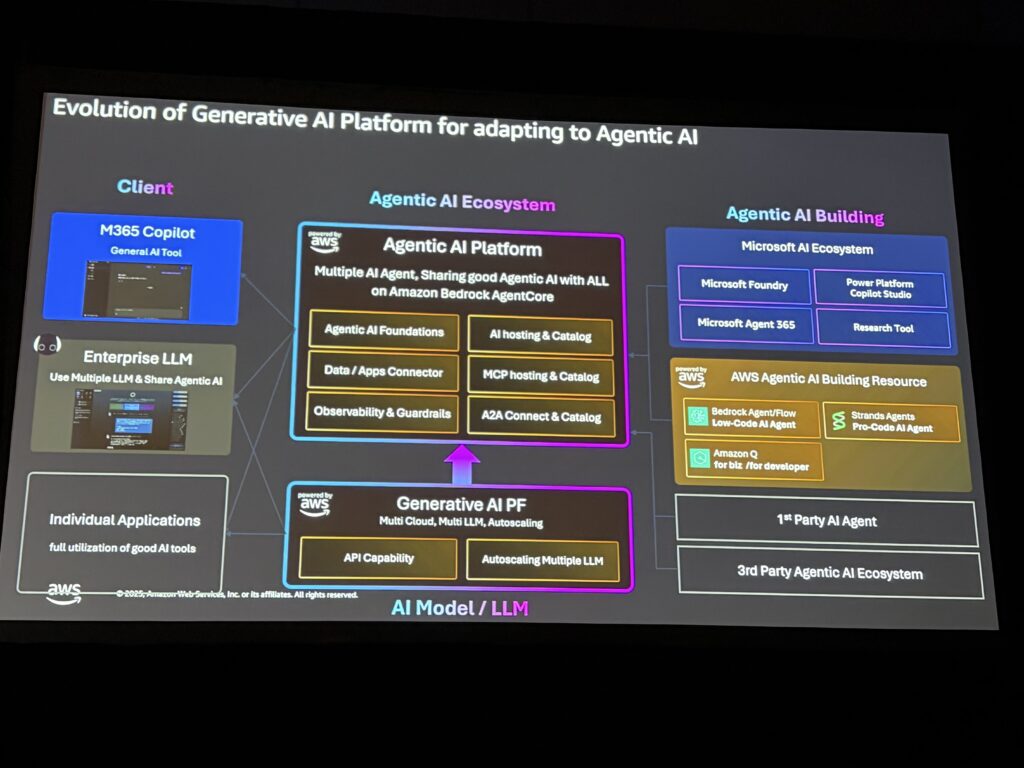 特にクロスプラットフォーム接続性が重要だったそうです。Sony Groupでは既にM365 Copilotを多くの社員が使っており、それとAgent Core上のエージェントを連携させたいというニーズがあったとのこと。