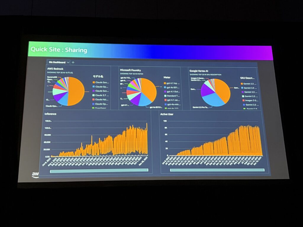 Sony Groupのように、ビジネスユーザー向けにもダッシュボードを提供するというアイデアは面白いですね。社内のAI利用状況を可視化する際の参考になりそうです。ここにQuick Suiteなど絡められると、さらに面白いと思います。
